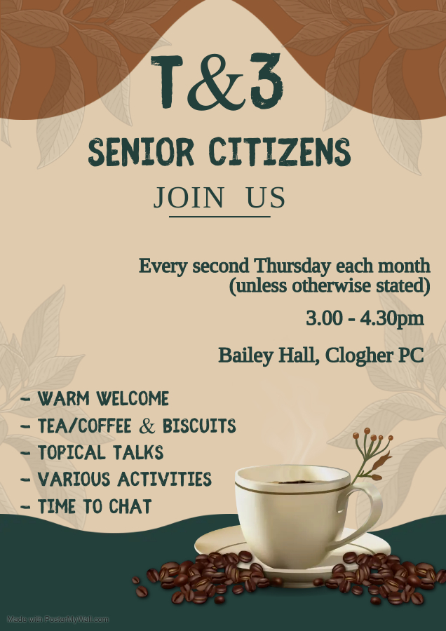 T&3 (tea, coffee, chat & company) is an initiative for senior citizens in Clogher and Glenhoy Presbyterian Churches and the local community. T&3 will meet on the 2nd Thursday of each month, unless otherwise stated. Please see the poster below for more details.